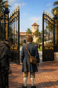Candide stond voor de vergulde poorten van het monumentale gebouw, waar de felle zon de waarheid leek te willen verblinden.