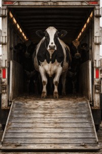 De vrachtwagen schudt over de weg. Licht lekt door de kieren en vlekt over ruggen en flanken. De lucht is warm en vochtig van adem. Rompen drukken tegen elkaar aan, hoeven glijden over hout.